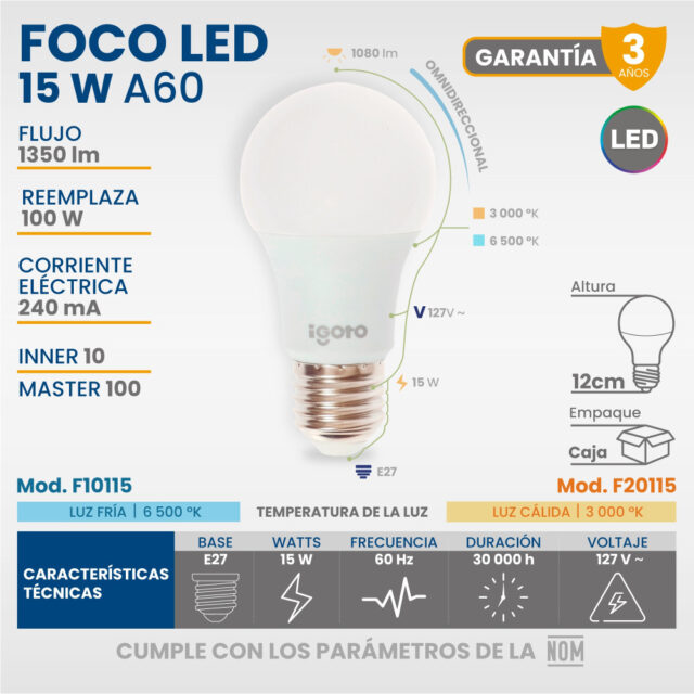 FOCO LED A65 15 W 6500 K (LUZ FRIA)