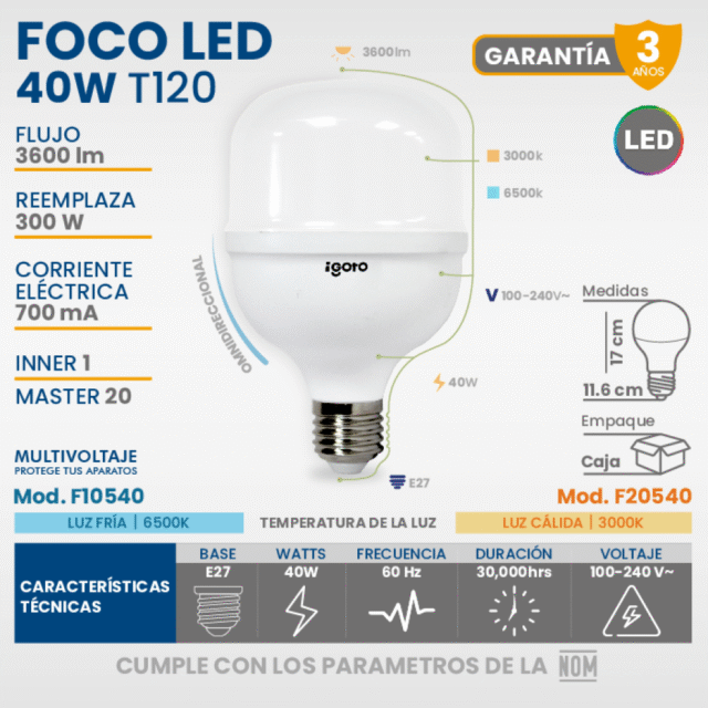 FOCO LED DE ALTA POTENCIA T120 40 W 6500 K (LUZ FRIA)