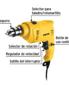 - Selector de función taladro o rotomartillo, con perilla de velocidad variable
